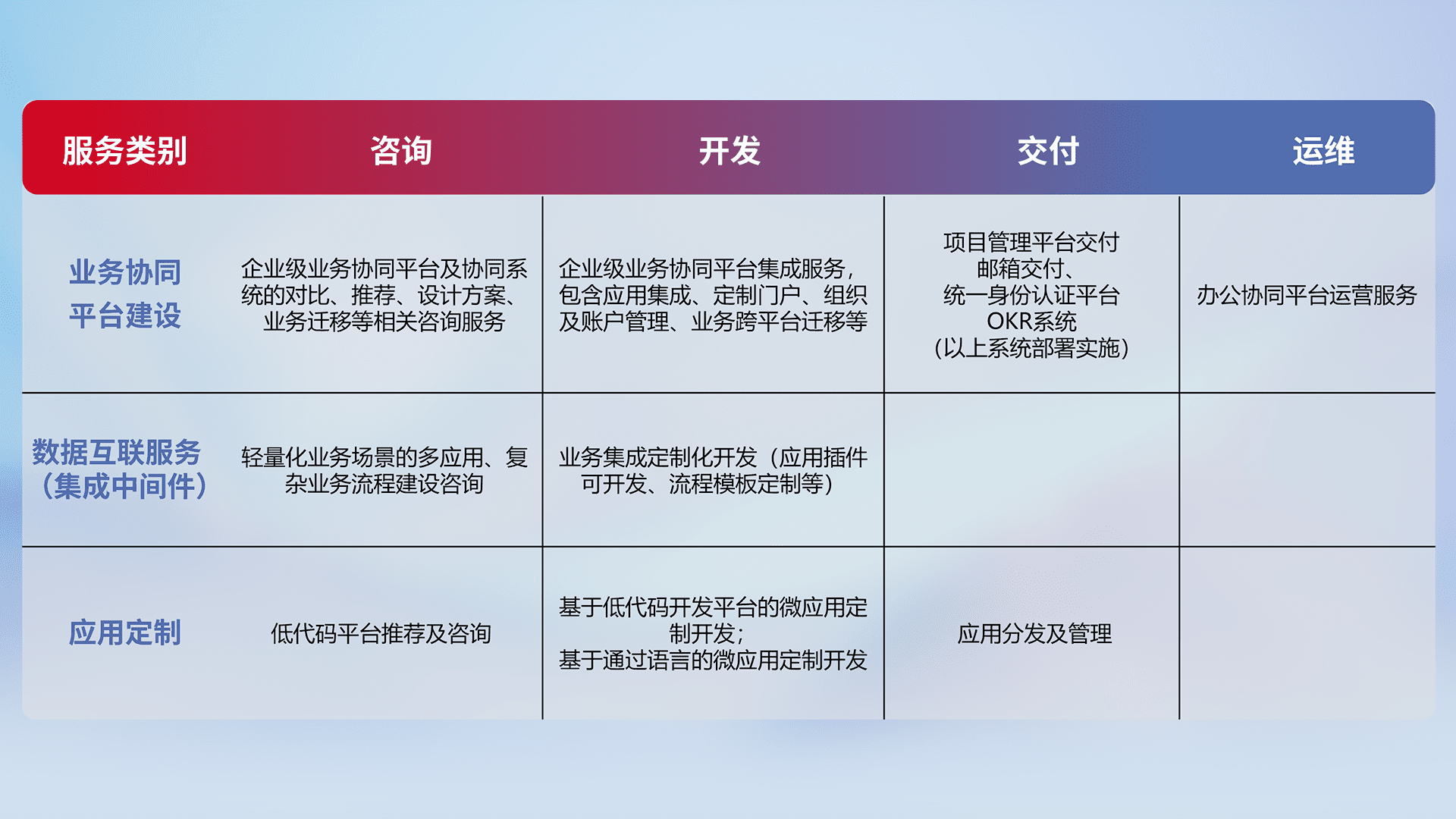 针对钉钉、、、企微、、、IDaas等平台级产品提供产品的规划、、、、方案、、、、交付、、、定制化开发等服务,,,实现如统一协同办公、、、智能客户服务、、混合会议管理、、、智能数据查询、、、等业务场景,,,,实现数字化转型。。。。