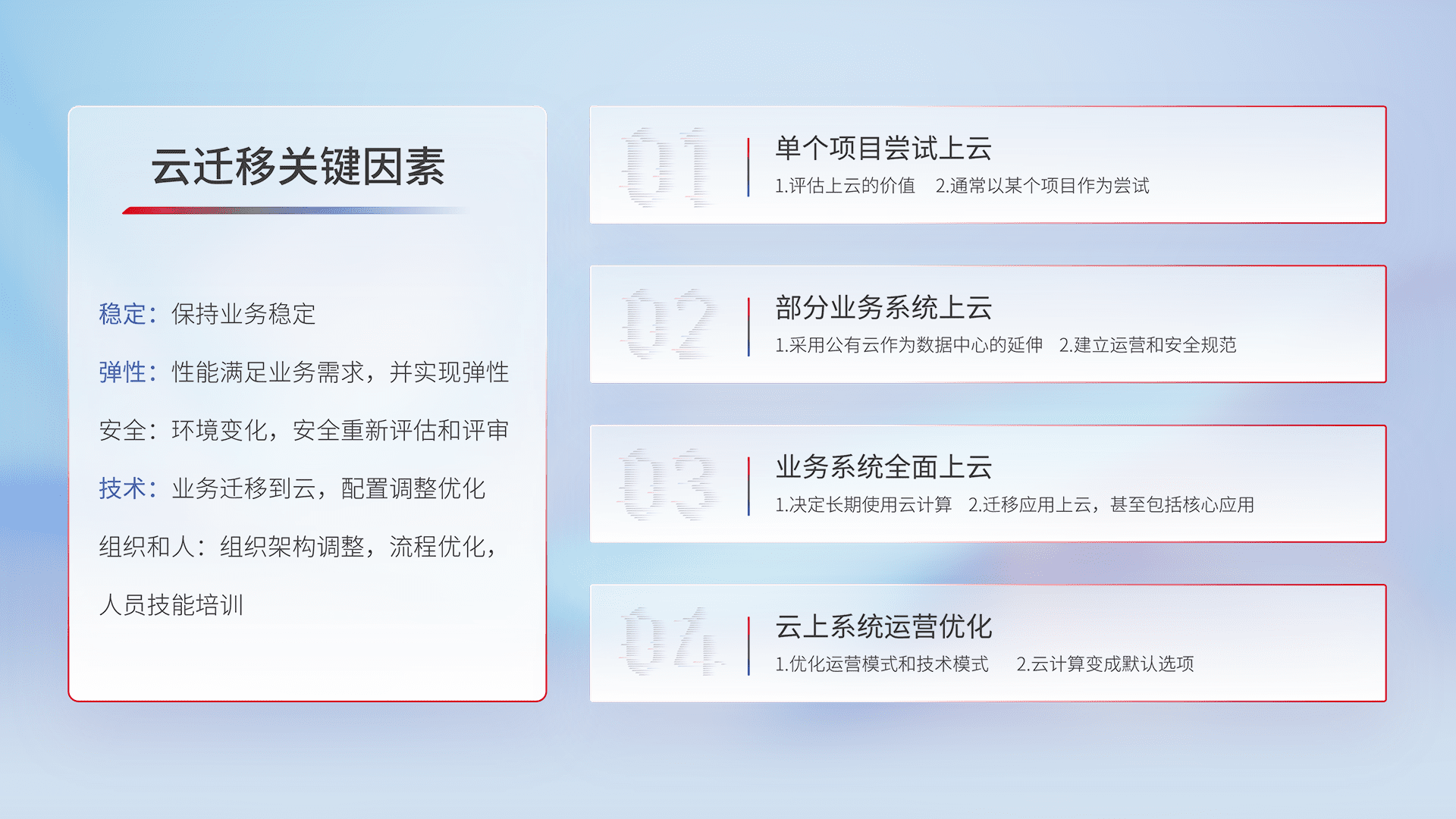 结合实际业务,,,从规划设计、、、、云平台选型、、云原生改造、、、数据迁移、、、集成交付,,迁移全过程为客户识别最佳上云路径,,,做好风险识别管理,,,,设计网络架构、、、、身份权限、、安全审计合规、、、、操作审计、、、、日志审计、、监控告警策略、、多站点容灾设计等,,,,对云上基础设施进行整体规划,,,提升IT治理水平,,,以满足弹性、、、、高可用、、、高性能的需求。。。