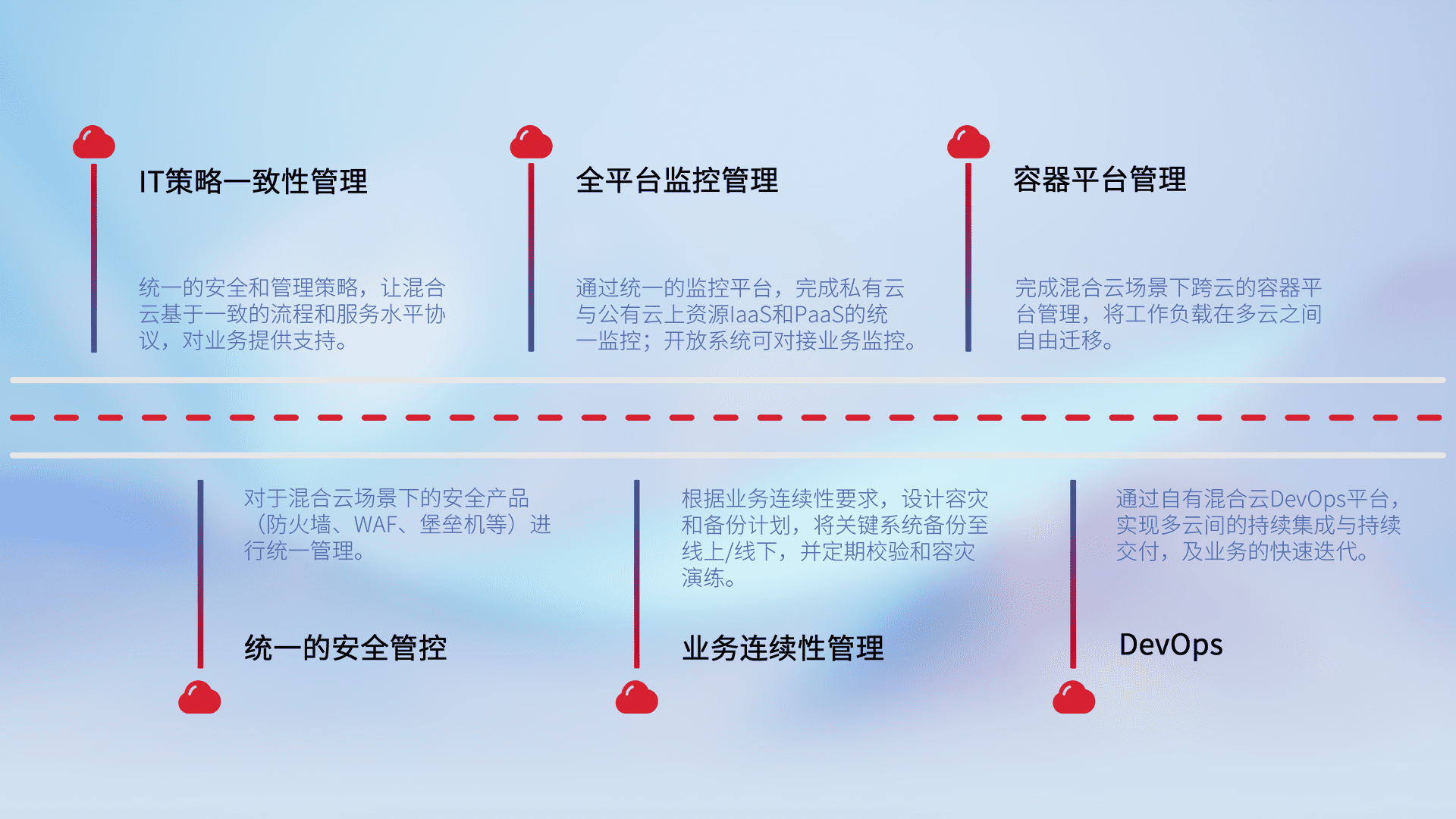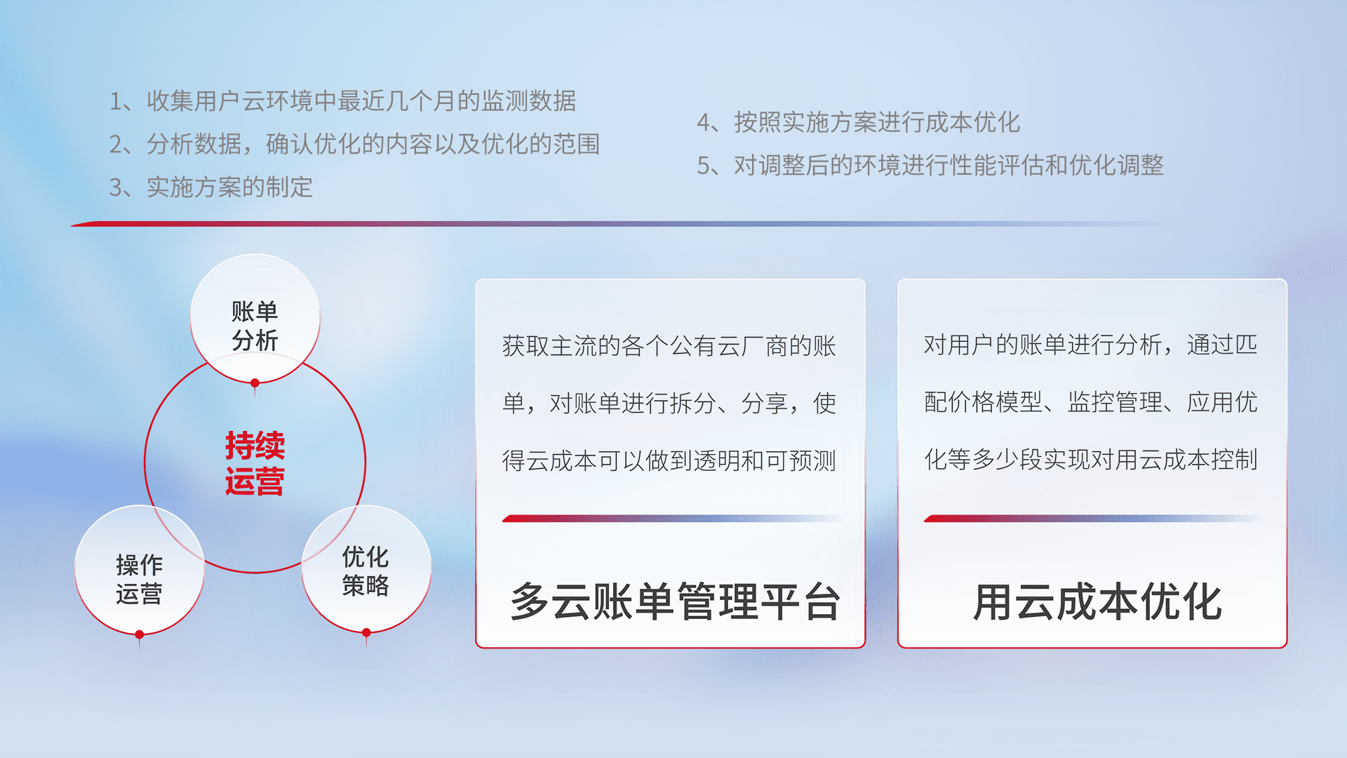 通过多云纳管,,,,以统一的资源数据模型把客户的云资源进行抽象和封装,,,进而实现对多云资源的统一操作,,保障云资源管理的可靠性、、、、稳定性与可用性。。。。量身定制化运维内容,,配置、、、、开发运维、、、补丁管理、、备份、、、、监控、、、认证和访问管理、、审计和日常巡检等,,,,保障在用云过程中的可靠度,,,稳定度以及高可用率。。。