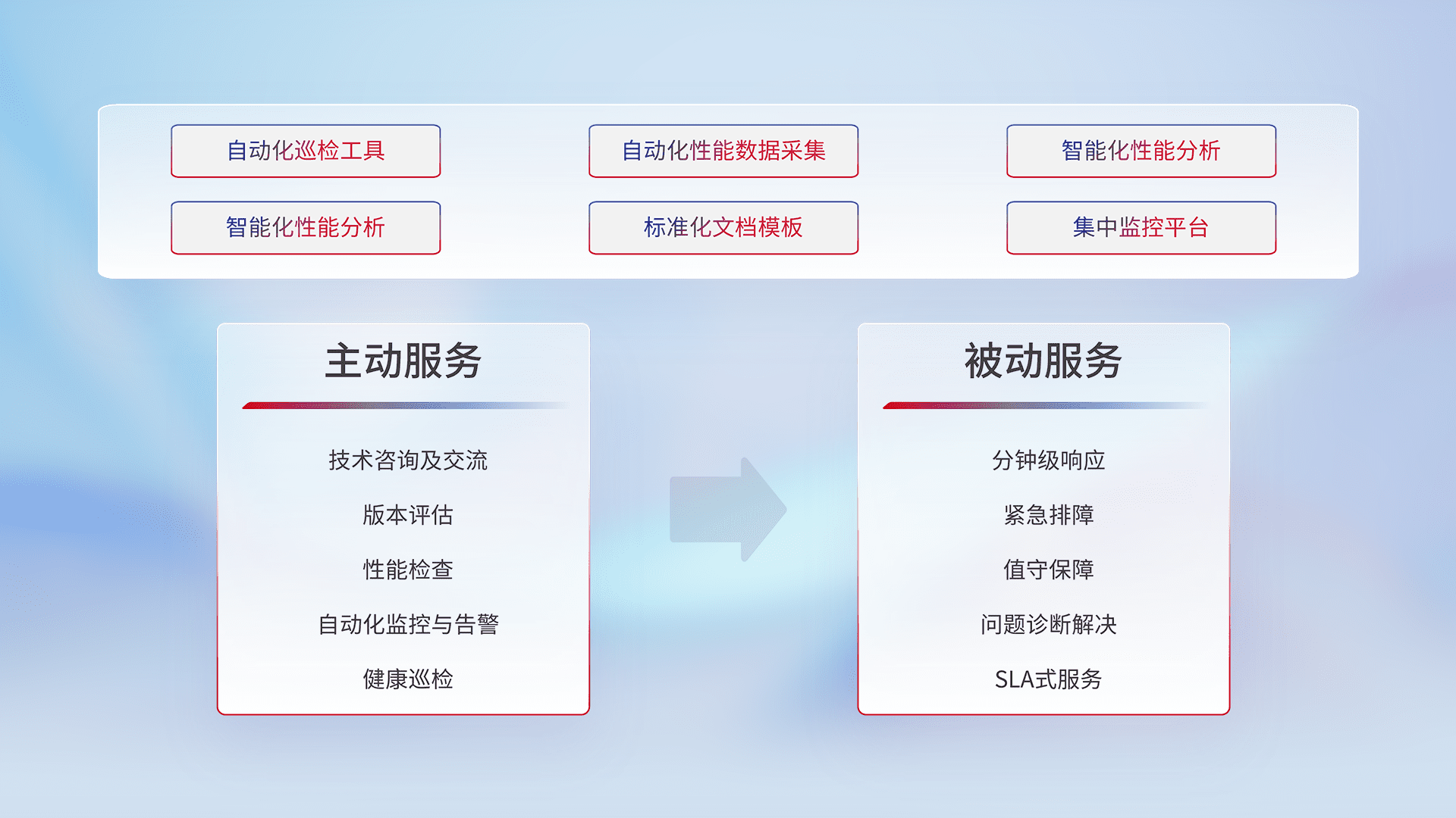 智能化工具和标准化文档,,保障服务质量,,,,提供主动服务(包含技术咨询、、、版本评估、、性能检查、、自动化监控与告警、、健康巡检)和被动服务包含(分钟级响应、、紧急排障、、、、值守保障、、问题诊断解决、、、、SLA服务)。。
