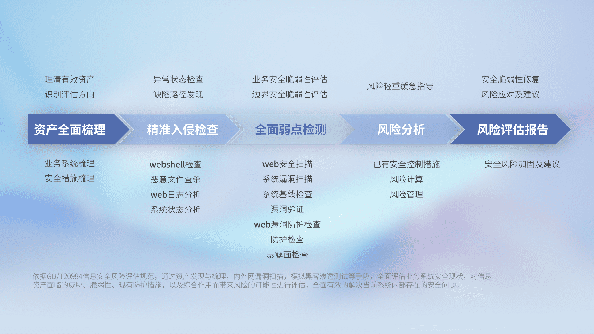 针对客户行业特性,,以专业的安全服务+多厂商联合解决方案提供专属的一站式安全管理服务,,,帮助客户全面感知网络空间威胁,,,基于识别、、检测、、、、分析、、、防护、、、、监测、、、响应的服务理论模型,,,,从方案咨询、、、、集成交付、、评估验证、、优化加固、、、、运维运营,,,致力于为客户提供完整的闭环管理式安全服务。。以实战经验为客户打造高抵御风险的安全体系,,,帮助客户发现威胁、、对抗威胁、、处置威胁,,不断积累安全对抗能力,,持续保障数字化安全。。。